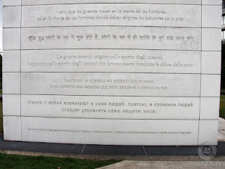 Перші строки Уставу ЮНЕСКО викарбувані на кам’яній стелі, яка встановлена на площі Толерантності на території штаб-квартири. Цей напис виконаний на 6 офіційних мовах організації.  Ідею захисту миру, ідею прагнення гармонії в світі та поміж людьми, народами несуть твори великих майстрів – гуманістів, які брали участь в оформленні залів ЮНЕСКО.