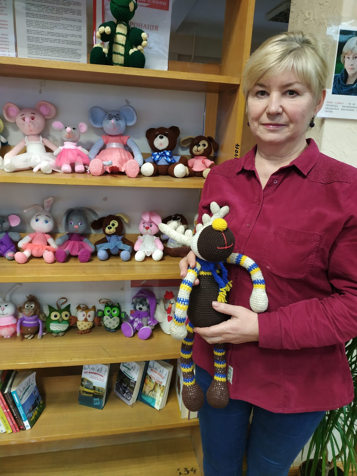 Напередодні Дня благодійності книжкову полицю в бібліотеці зайняли добрі іграшки – творчі витвори Віри Тимофіївни Болькіної – волонтерки з 2014 року. Народилась вона в
